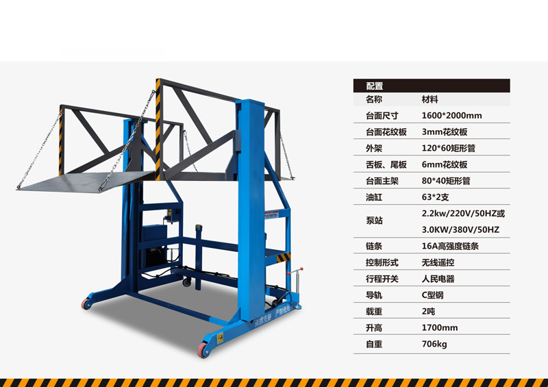 安全防护:液压安全锁防意外坠落、防滑台面、防护栏 / 裙板、限位装置等。